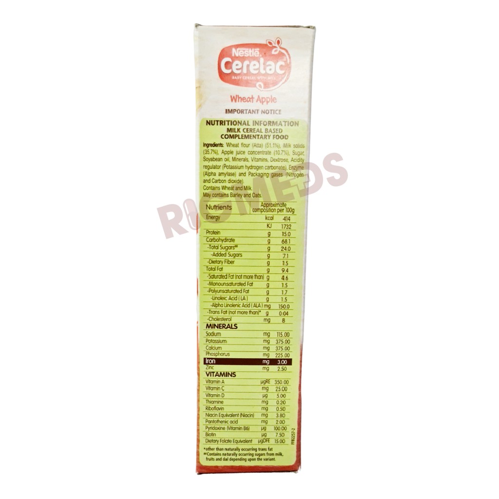 - Nestle Cerelac Baby Cereal With Milk Wheat Apple From 6 To 24 Months Refill Pack (300 Gm) contains important nutrients, including vitamins and minerals